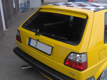 Heckscheibenblende vom Golf II GTI in Wagenfarbe, Griff für Heckklappe in Wagenfarbe, liegende Endstellung vom Heckscheibenwischer