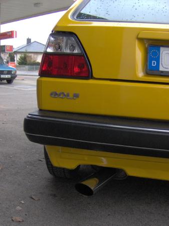 rot-weiße Rückleuchten, Auspuffendrohr vom Passat